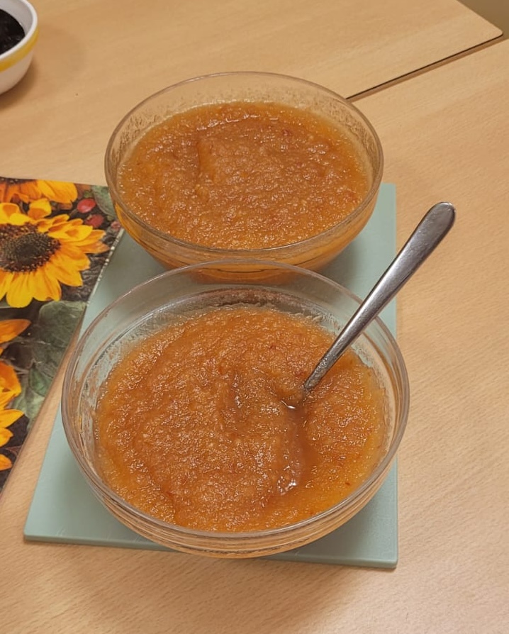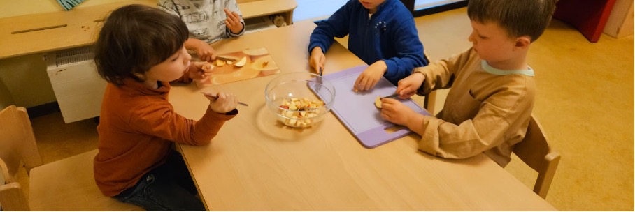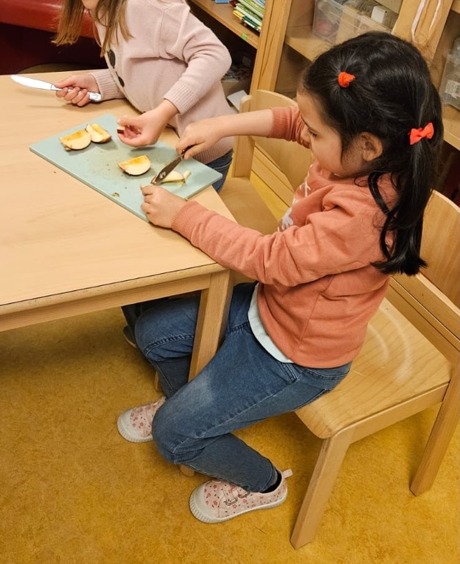 Zurück im Kindergarten ging es ans Werk: Mit Lili schnitten die Kinder die Äpfel klein, anschließend kochten und pürierten wir das Apfelmus. Parallel dazu wurde der Waffelteig vorbereitet. Schon bald duftete der ganze Kindergarten nach frisch gebackenen Waffeln – eine warme, gemütliche Atmosphäre, die sofort gute Laune machte.