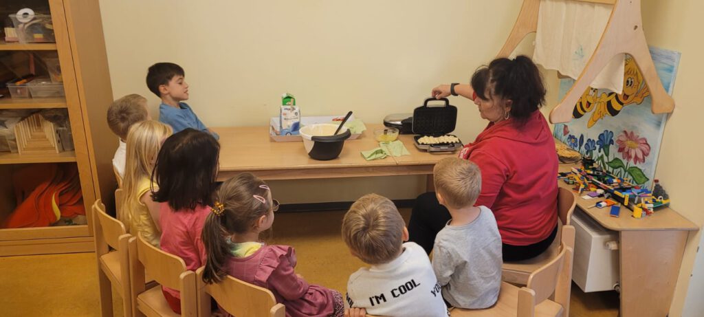„Es riecht schon nach leckeren Waffeln!“, riefen die Kinder begeistert. Einige wünschten sich direkt, dass dies zu einer Tradition werden sollte. Ob beim Mischen, Backen oder Dekorieren – jedes Kind brachte sich mit Freude ein. Am Ende schmückten Waffeln in Herz- und Rechteckform, serviert mit Apfelmus, Vanille und Puderzucker, unseren Frühstückstisch.
